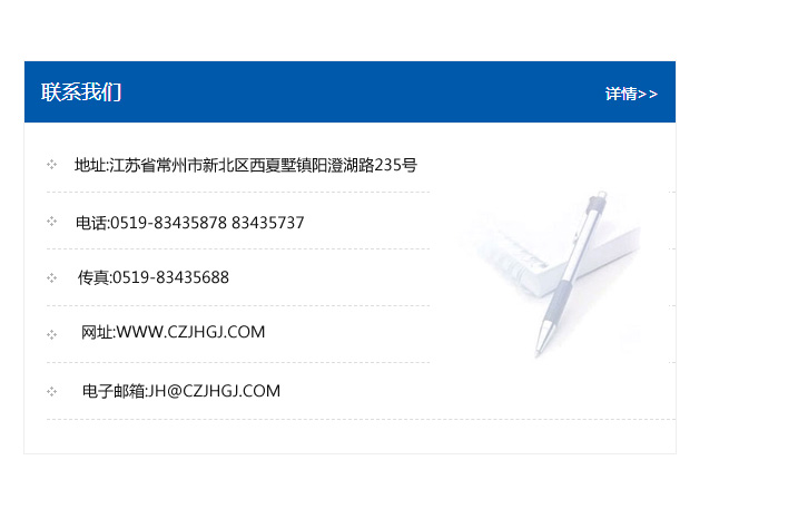 地址:常州市新北區友邦商務大廈1幢16、17層  電話:0519-85101652  傳真:0519-85112595  郵編:213022  網址:www_cz-jiayue_cn.lychanghong.com  郵箱:xiajifengaa@163.com
